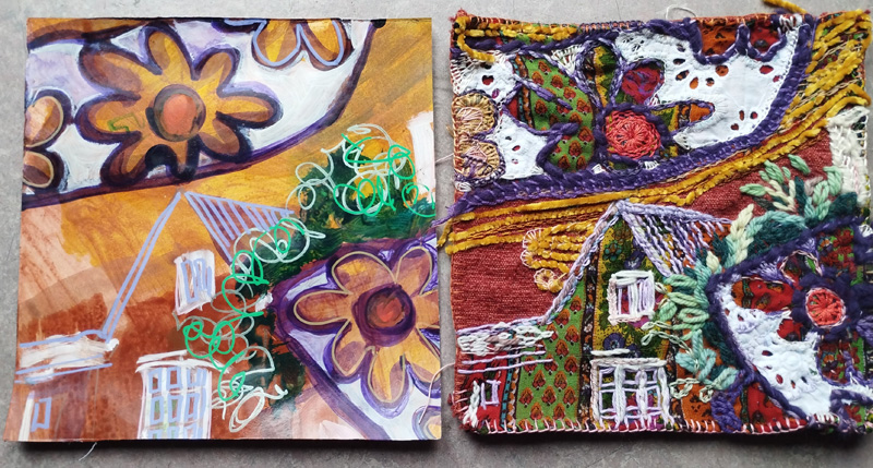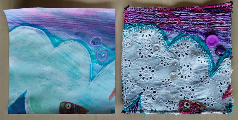 Ieder stukje van 25x25cm wordt zo goed mogelijk in textiel nagemaakt. Alles mag, van naaimachine tot kraaltjes, pailletjes en kruissteek.