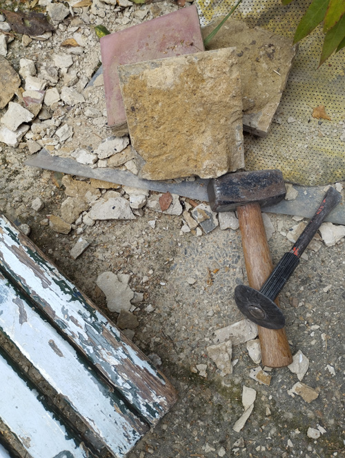 Er moeten nog meer tegeltjes gebikt worden en in deze hoek moet nu ook de ondervloer in cement gelegd worden om de ratten de toegang te verhinderen.